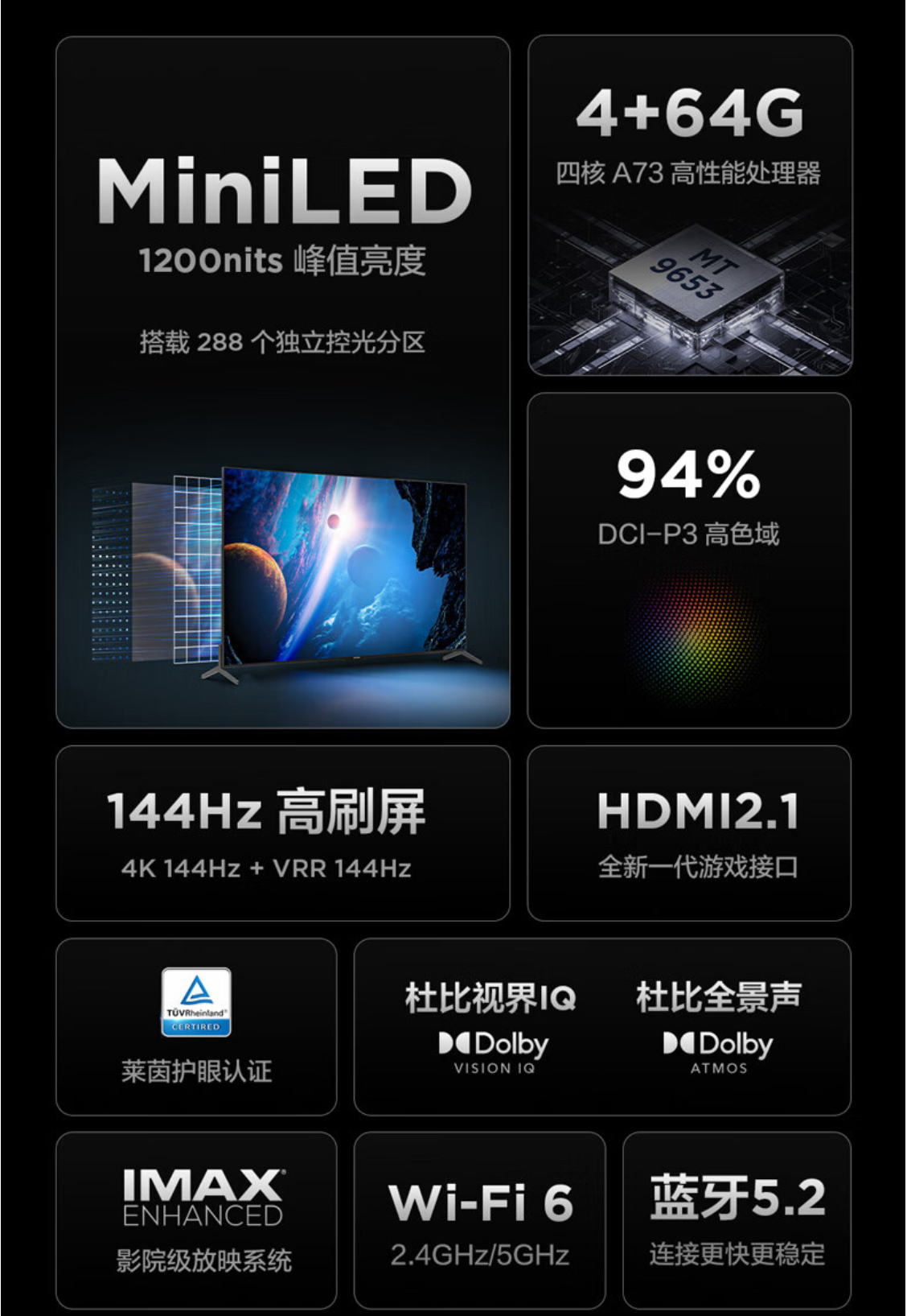 雷鸟23年新品,从堆料上来说比R645C的配置更高,最大的亮点就是采用了MiniLED背光。屏幕上采用了VA软屏,峰值亮度达到了1200nit。核心的分区控光性能上,分别达到了288区(65英寸)和360区(75英寸),标准的真HDR电视,画质表现还是很给力的。硬件上配备有A73四核1.4Ghz处理器,搭配4G+64G存储组合,日常运行流畅无卡顿。其他配置还支持MEMC运动补偿、94%DCI-P3广色域、双频WIFI6、杜比视界/全景声和全功能口等。另外游戏体验方面做了专门的低延迟输入优化,同时支持VRR和ALLM,加持全功能口很适合搭配主机游戏机使用。此外R675C延续了雷鸟一直的开机无广告设计,配合不错的定价,很适合兼顾性能体验和性价比的小伙伴。