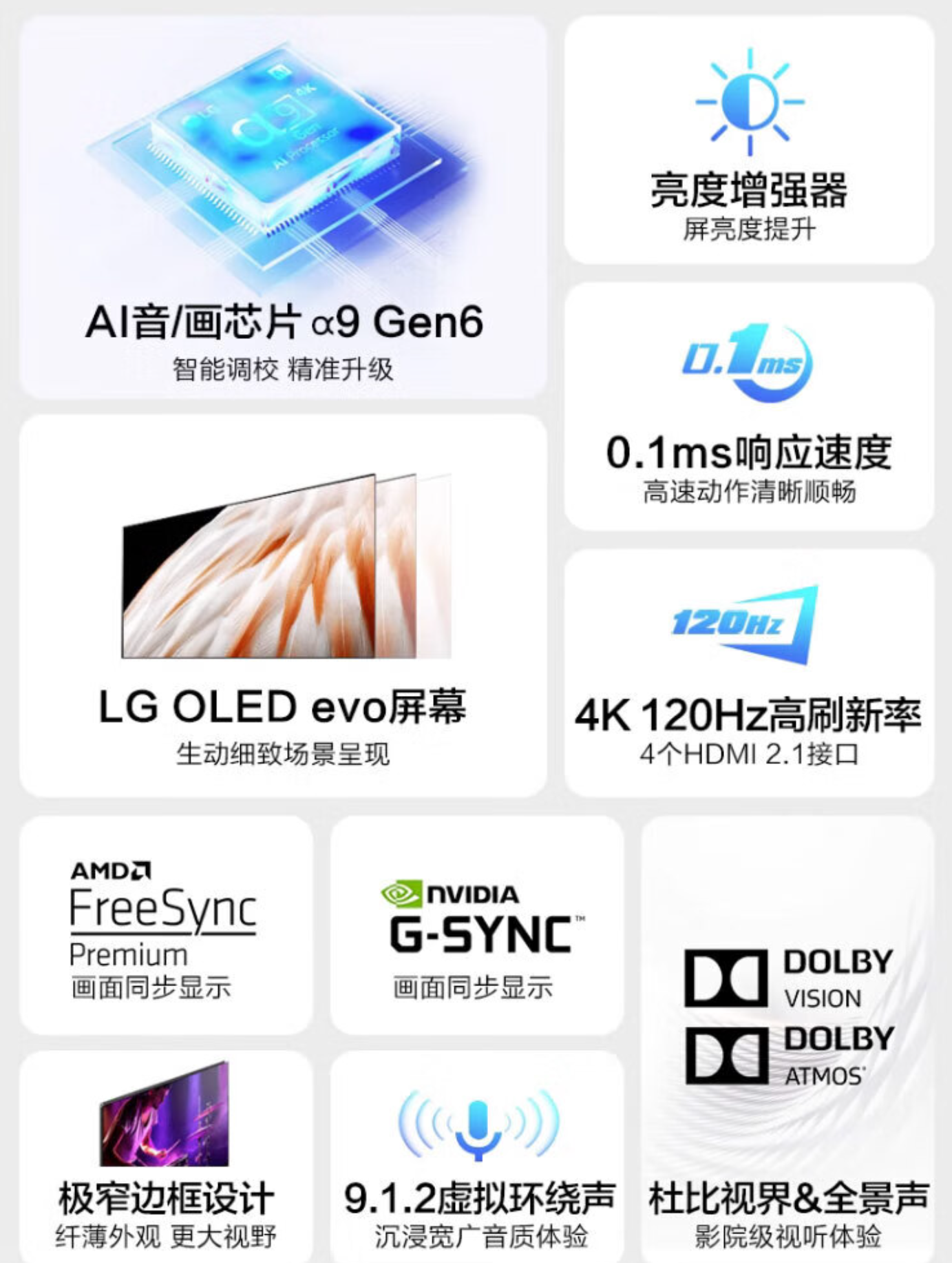高端游戏电视配备有完整的接口,同时有出色的HDR效果(高峰值亮度、广色域、高控光分区或者是OLED电视)。可以获得极致游戏体验,就是对预算的要求会稍高一些。