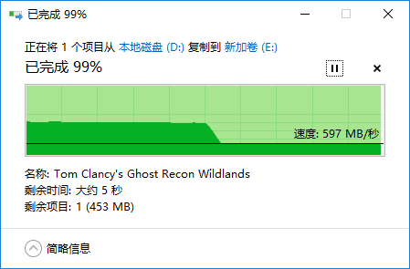 24GB的SLCCache平常绝大多数情况都用不完,基本上没多少事情会在短时间内写入24GB这么大的数据量,当然事情总有例外,复制游戏进去的时候就很可能会出现这种情况,现在的游戏动则几十G,把那24GB的SLCCache用完是很有可能的,不过即使耗尽写入速度也有600MB/s,其实还是很快的,而且SLCCache的清空速度很快,写入完成后过一段时间速度就会恢复正常。