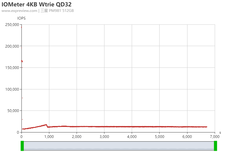 在使用IOMeter对SSD全盘进行两小时的4KQD32随机写入后所记录下来的IOPS离散分布情况,虽然有24GB大的SLCCache,不过如果全速写入的话还是会一下子消耗完的,缓存用完那一刻只有7000IOPS,这时SSD的写入速度是最低的,应该在写入的同时清理SLCCache空间,速度稳定后维持在12000到14000IOPS之间,SLCCache在写入结束之前再也没启动过。