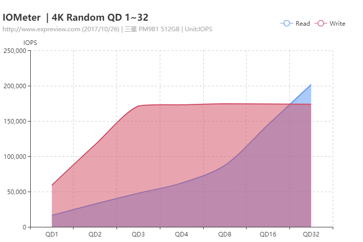 三星PM981512GB的随机性能随队列深度的变化