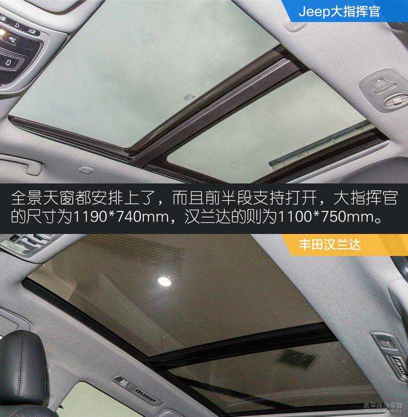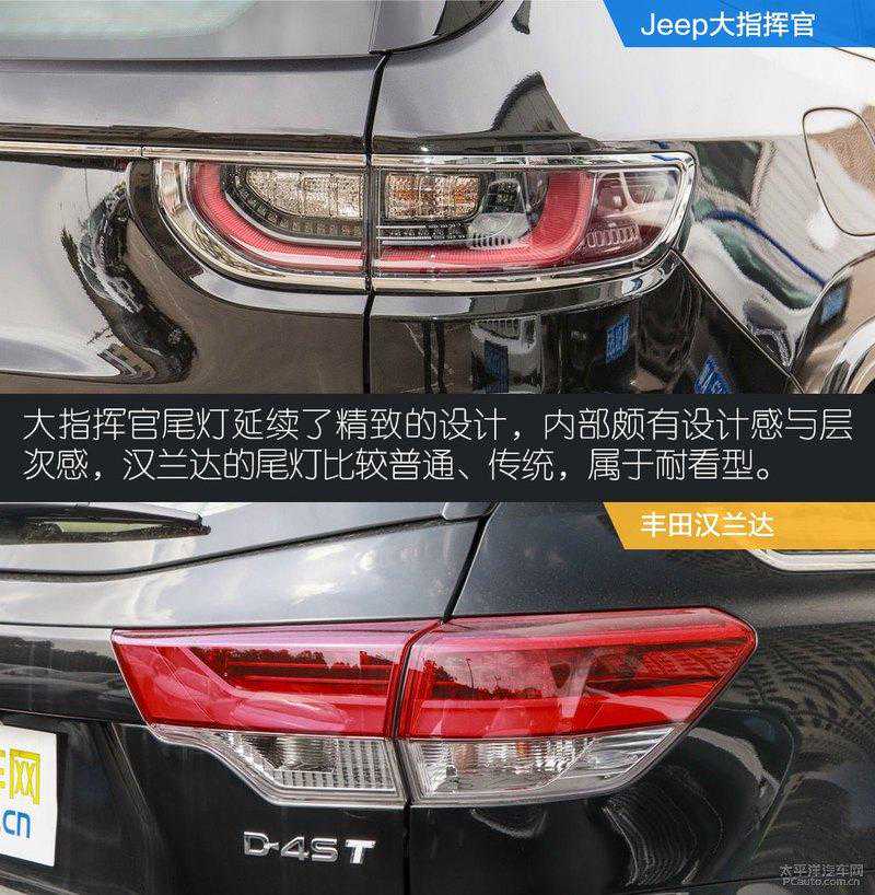 外观小结:两款车型都有各自家族的设计特点,但从外观方面看,大指挥官无疑是拥有更强的设计感,它并没有采用棱角分明的设计,而是利用曲线/面来营造肌肉感和光影效果。汉兰达的造型设计更偏向于耐看、经典,大部分的设计都是为了家用。