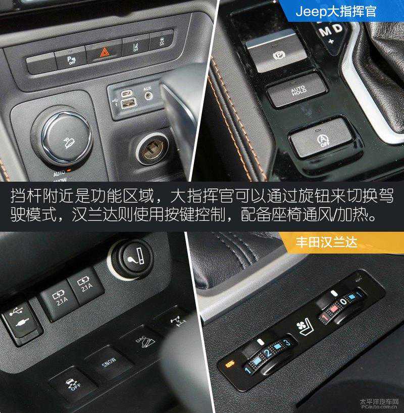 大指挥官在前排位置设置了多种接口,包括了type-c、USB、AUX和12V电源接口,另外还可以看到配备了车道保持、自动驻车等功能。汉兰达同样配备了USB、AUX等接口,值得一提的是,它还支持座椅加热和通风功能。