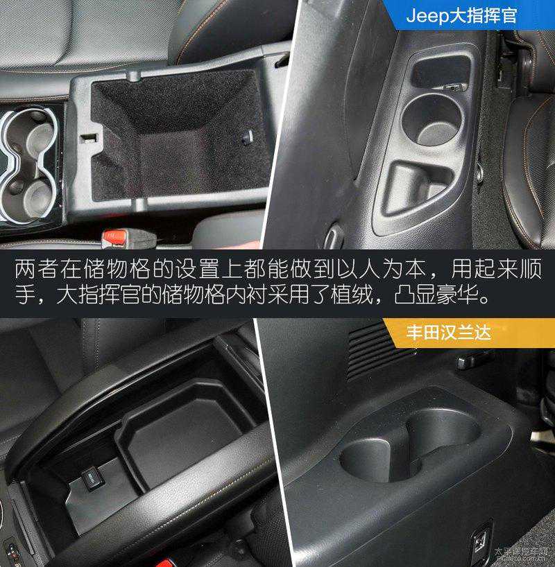 大指挥官通过做工用料来渲染一种豪华感,细节部分也能体现出这种用功,例如手套箱、扶手箱等内衬采用植绒,座椅为全真皮包裹等;汉兰达则在通过中控台的功能布局强调它的实用主义,贯通式的储物格是它的特色了,前排扶手箱内的空间也比较灵活。