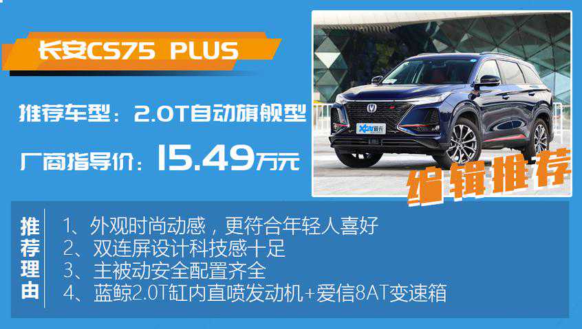 车型点评:如果曾经的中国品牌车型的目标是媲美合资品牌,那CS75PLUS已经在此基础上又迈出了一大步,无论是设计、配置还是安全,各个方面都做到了无死角,尤其是安全性能,不仅达到了C-NACP五星碰撞标准,在国内目前最为严苛的中保研碰撞测试中也达到了“优秀”标准。包括全速域自适应巡航、全速域自动刹车、全速域并线辅助等在内的智能化辅助驾驶系统和带有识别周围环境功能的自动泊车系统也让CS75PLUS在科技配置方面也有着领先对手的实力。所以有什么理由不选这辆高颜值的实力派车型呢?