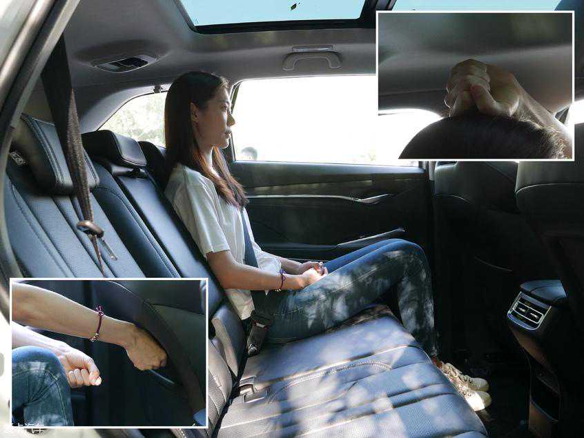 保持前排位置不变,同一体验者坐进后排,此时头部仍有一拳的空间,腿部更是有将近三拳的剩余空间,表现十分出色。此外CS75PLUS的后排地板几乎全平,中间位置也能有比较舒适的乘坐体验。