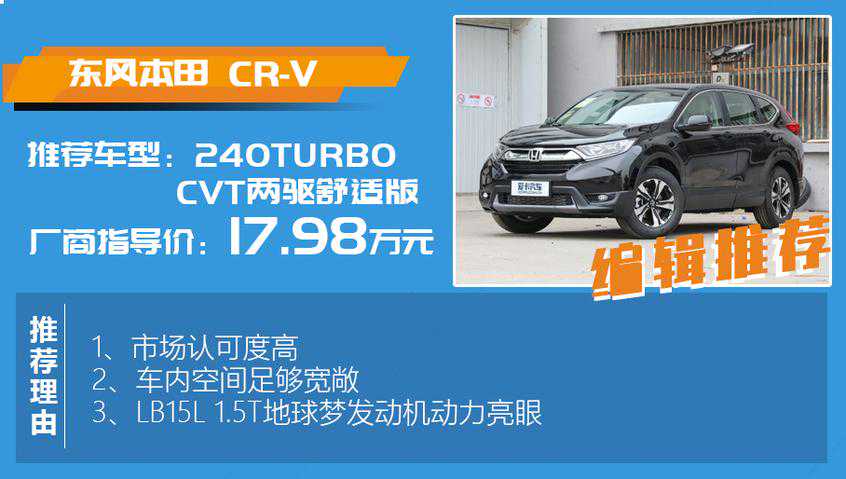 车型小结:CR-V绝对算是车坛常青树,低调内敛的外观、简约实用的内饰以及宽敞的车内空间都能很好的满足家用需求。1.5T地球梦发动机不仅动力参数非常亮眼,实际表现也可圈可点。不过入门版配置并不算丰富,但是绝对可以满足日常实用需求。