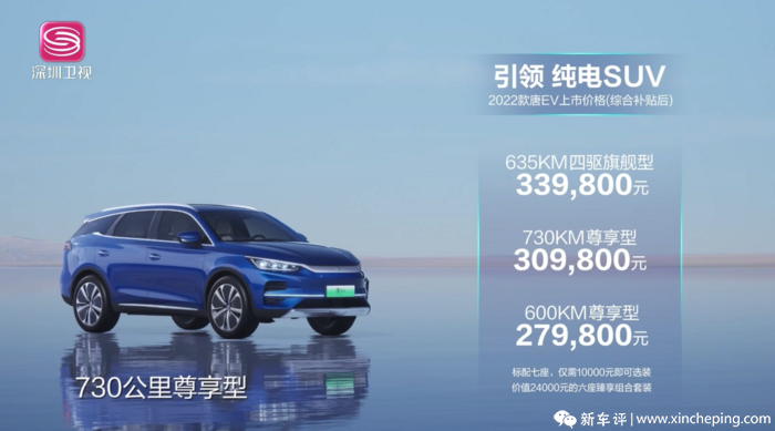 改变也挺大的,2022款唐EV搭载大容量刀片电池,CLTC续航里程达到630-730km;四驱车型百公里加速4.4秒;提供6座和7座版本选择,第二排座椅支持加热通用、按摩功能;搭载智能香氛系统、丹拿音响、DMS疲劳驾驶监测系统、APA智能全景自动泊车等功能。6月1日,比亚迪2022款唐EV正式上市,共推3款车型,7座标准版售价区间为27.98-33.98万元,在7座车型基础上,加1万元可选6座臻享套装。