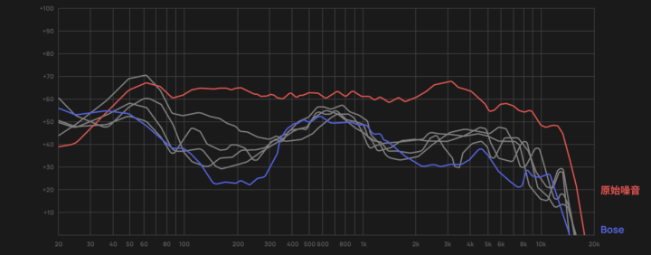 在降噪曲线中,我们能发现,Bose在100-300Hz的降噪部分是最明显的,这部分主要是飞机、汽车的引擎声。跟我们在消声室用人头录制的降噪效果一致。