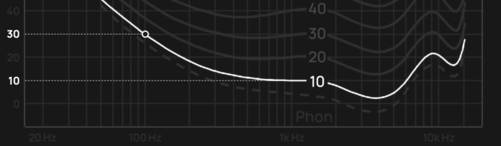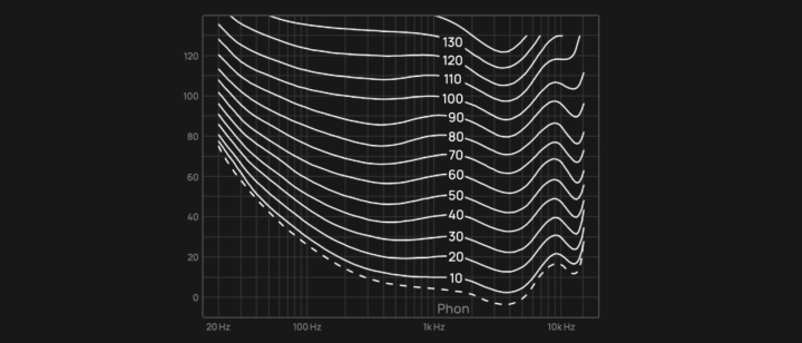 行业内做了大量的实验,通过对不同频率声音的听感测试,得到了这张等响度曲线。耳朵要获得相似的听感,1000Hz的声音只需要10dB,100Hz的声音需要30dB。从图中也能看到我们对高频的敏感度更高。