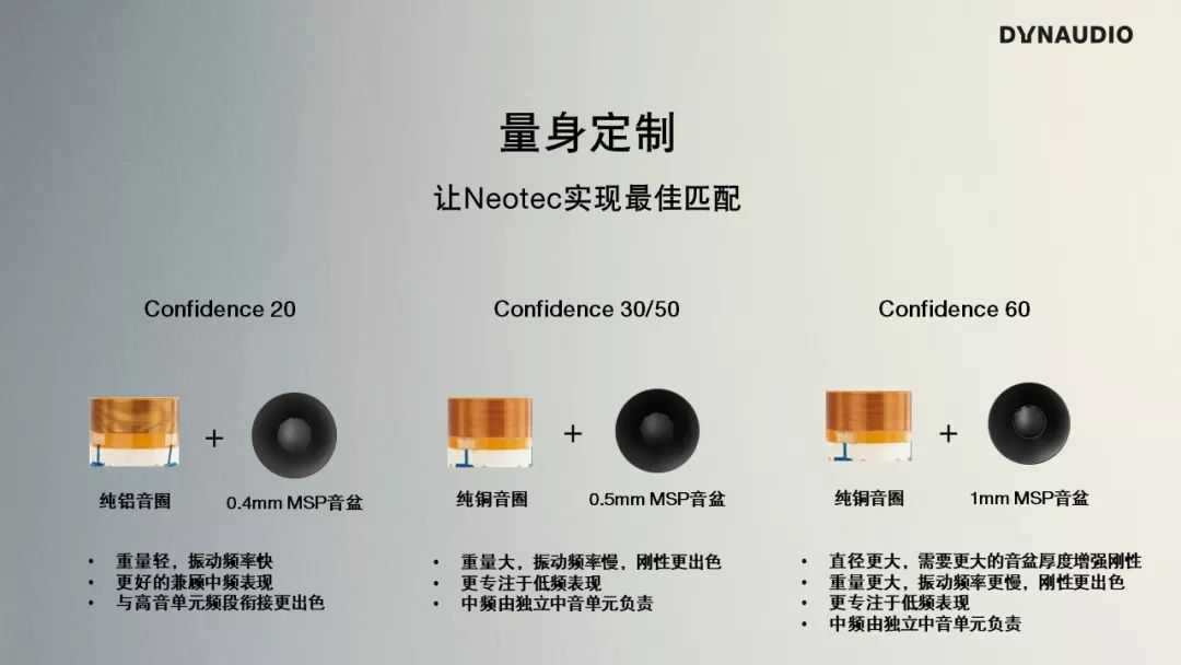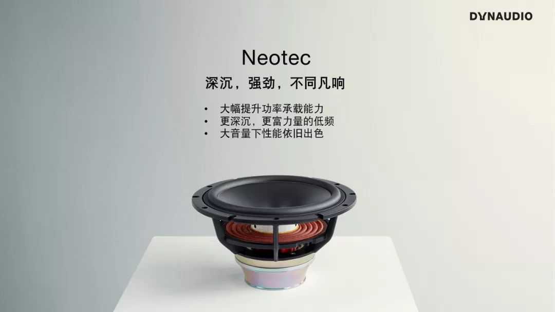 NeoTec低音单元使用了性能更强的大型超高级钕磁体并采用外磁设计。单元内部使用了最多达三层的玻璃纤维音圈骨架,具备卓越的刚性。因此它具有强悍的细节表现,动态范围和功率承载能力。此外,NeoTec低音单元在气流通畅性方面也得到显著加强。但另一方面,NeoTec低音单元依然使用了丹拿著名的MSP(硅酸镁聚合物)音盆。除此以外,针对不同型号的要求,NeoTec设计了多个版本,它们采用不同厚度的音盆,并巧妙地在全新设计的音圈部分使用铝和铜两种材料,以确保在不同型号中拥有最理想的声学特性。