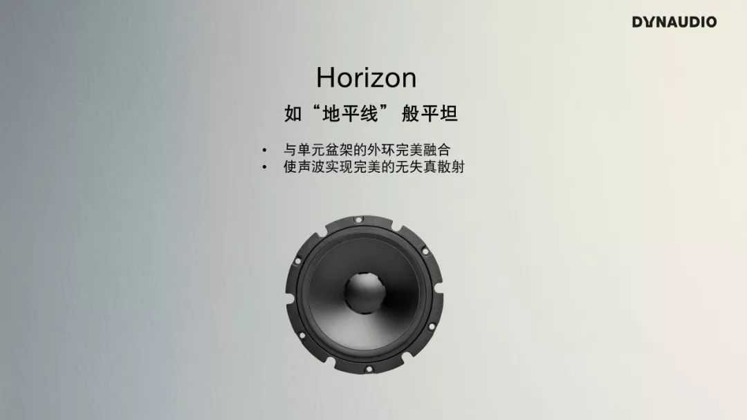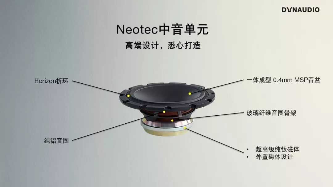 全新中音单元使用了和高低音单元相同等级的磁体和材料,并和NeoTec低音单元使用了相似的设计,因此它的名字依然称作NeoTec。这枚中音单元的一个与众不同之处就是使用了特殊的盆架设计,这使其在气流通畅性方面提升显著。另外,特殊的“Horizon”折环也是第一次在丹拿中音单元中出现。其外侧呈水平形状,与盆架平齐,内部则为锥形,可视为音盆的延伸,这种特殊的折环形状不但能与单元盆架的外环完美融合,还能使声波实现无失真散射,消除相位抵消现象。让中音更为清晰,准确。