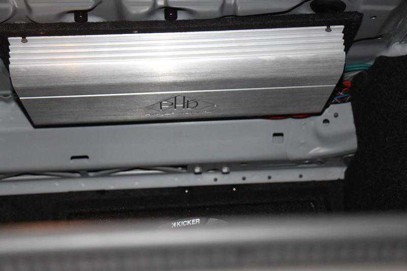意大利PHD4100功放安装在尾箱我们为省去尾箱空间采用吊装时安装在右侧隔板位置
