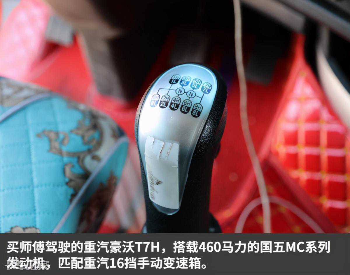 动力方面,买师傅驾驶的重汽豪沃T7H搭载的是460马力的国五MC系列发动机,型号为,排量为11L,峰值扭矩达到2200牛米。与MC系列发动机搭配的是16挡的重汽手动变速箱,型号为HW25716XSTCL,最高挡速比为0.833。