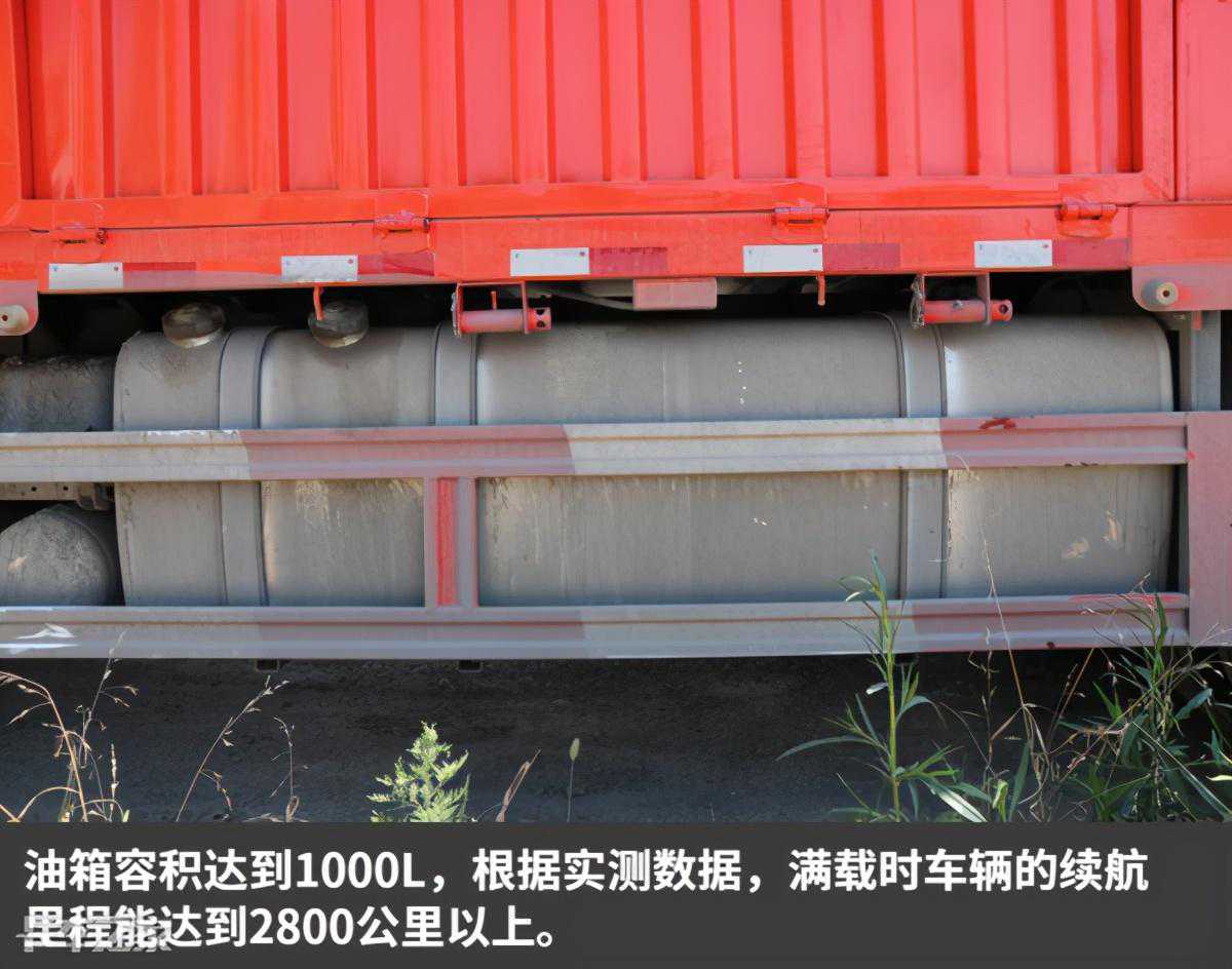 油箱容积达到1000L,根据买师傅的实测数据,这款车在满载状态下的油耗为每百公里35L,据此推算满载时车辆的续航里程能达到2800公里以上。