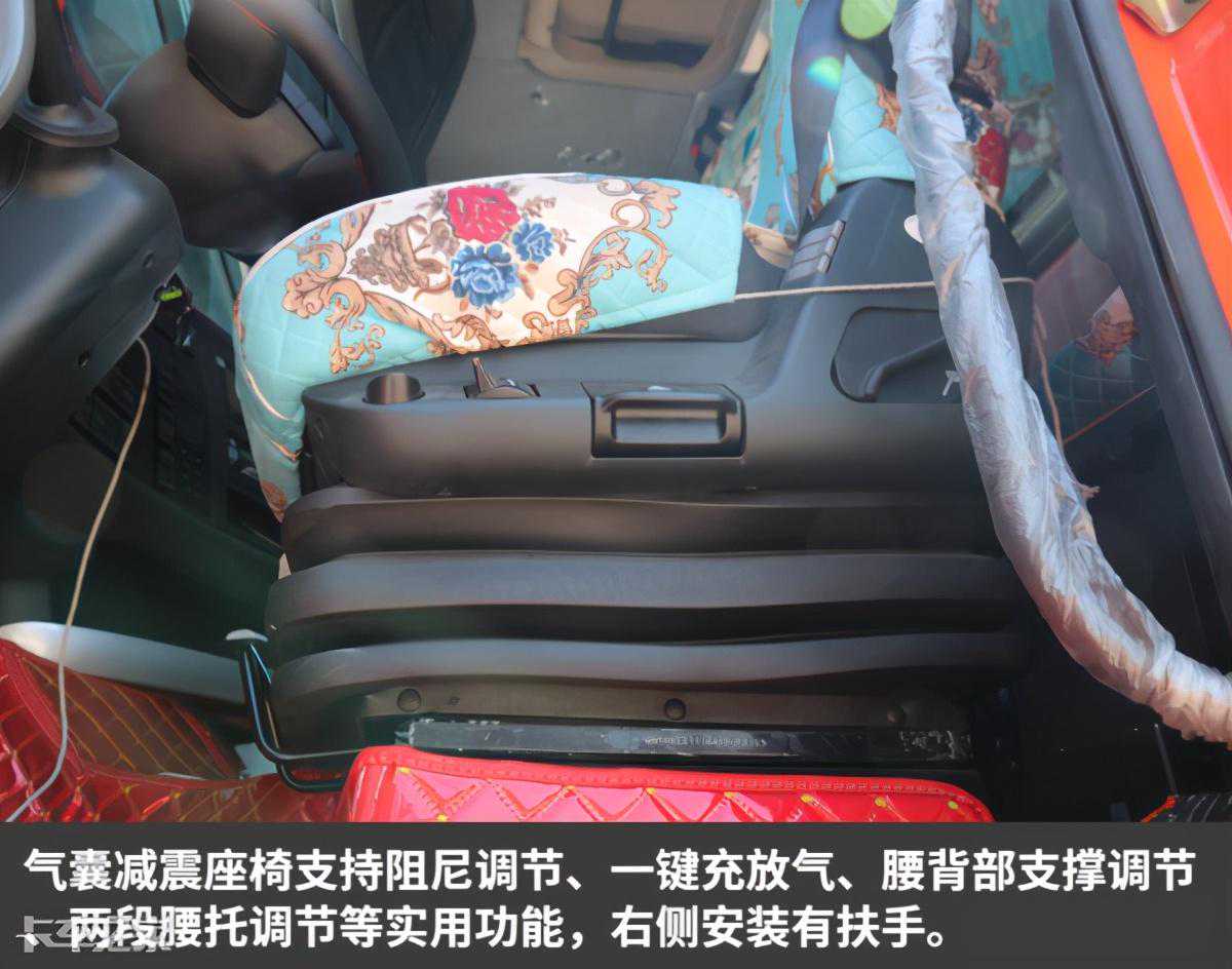 这款豪沃T7H的驾驶室在舒适度方面,向用户展示出不错的基本功。其主驾驶座配备的气囊减震座椅除了支持前后、高低、仰角调节等基本的调节功能外,还支持阻尼调节、一键充放气、腰背部支撑调节、两段腰托调节等实用功能。座椅右侧还安装有扶手,长期行驶时能帮助驾驶员有效减轻上肢疲劳。