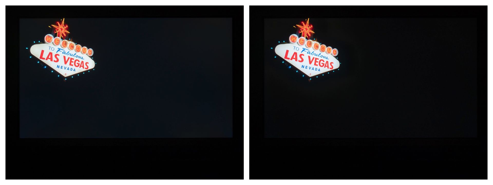 P27A6V的背光分区数为1152,开启局域控光后效果还是很明显的,以经典的拉斯维加斯灯牌画面为例。未开启局域控光时,受限于液晶面板的对比度(动态范围),画面的黑色部分无法暗下去,黑色的天空呈现微亮的观感。而开启局域控光后,1152个分区可以独立控制亮度,整个画面的动态范围大幅提升。灯牌附近的背光会打开到最亮,夜空背景部分的背光可以关闭,黑色的天空可以呈现更纯净的黑色。