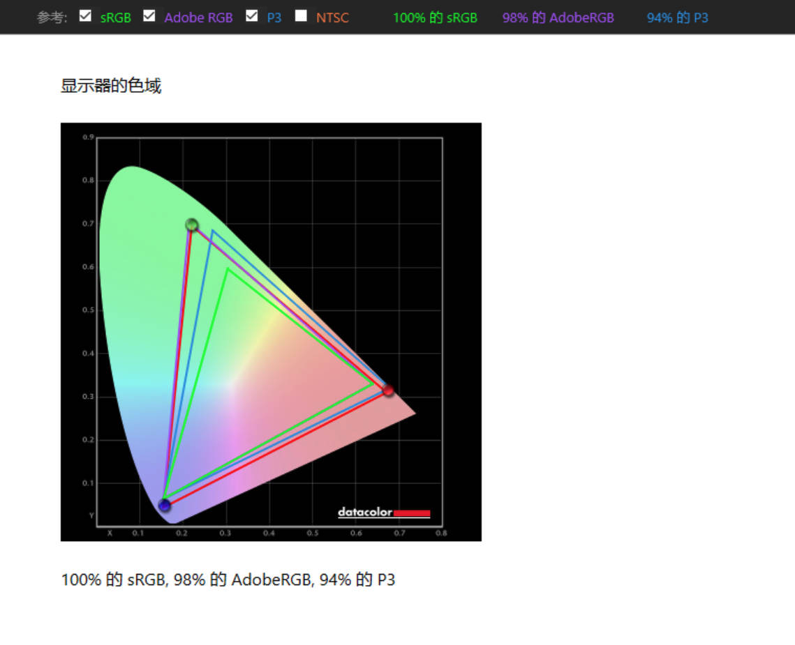 P27A6V采用了Mini-LED+量子点背光,实测原生模式下,覆盖100%sRGB、98%AdobeRGB以及94%的DCI-P3色域,数据与官方标称值基本相当,色域覆盖方面表现不错。