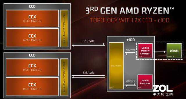 有人应该注意到了,这次三代锐龙的缓存非常恐怖,Ryzen93900X甚至高达72MB三级缓存,但其实三代锐龙还是使用了CCX基础模块,分成了4个区块,每块包含4个物理核心和一个16MB三级缓存,这里的缓存对比上代8MB提升了一倍。而每两块CCX组成了一个CCD硅晶片,使用第二代InfinityFabric技术与独立的I/O硅晶片互联。
