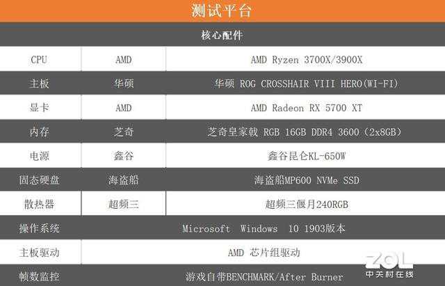 为保证此次评测能够发挥显卡的最佳性能,本次测试平台采用华硕ROGCROSSHAIRVIIIHERO(WI-FI)主板、AMDRadeonRX5700XT显卡、芝奇皇家戟RGB16GBDDR43600(2x8GB)内存、鑫谷昆仑KL-650W电源、海盗船MP600NVMeSSD固态、散热器为超频三偃月240RGB,详情请看下图。