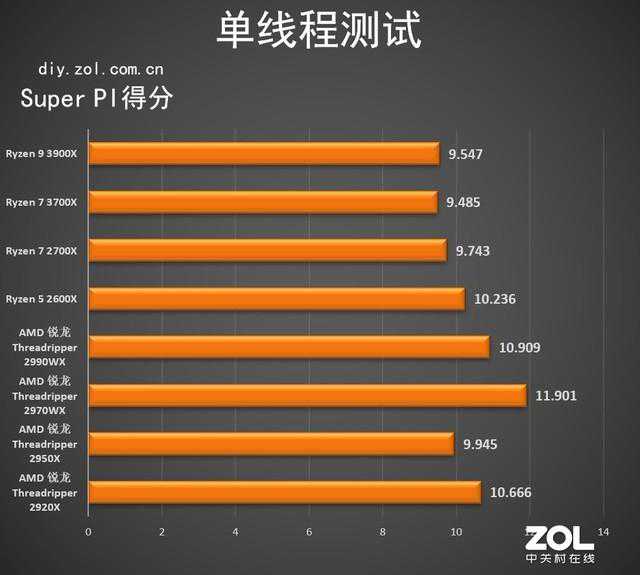 即使分别拥有12核心24线程和8核心16线程,AMDRyzen73700X和Ryzen93900X这次的单核表现仍然很亮眼,SuperPI仍少见的进去到了10以内,遥遥领先二代锐龙。