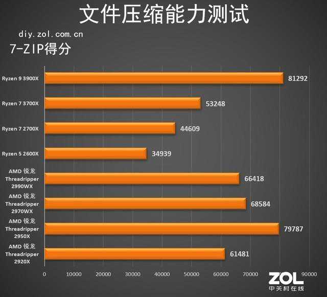在7-ZIP的压缩能力测试的得分中,Ryzen93900X达到了81293分,Ryzen73700X的分数为53248,对比二代锐龙旗舰Ryzen72700X,分别提升了82%和19%。
