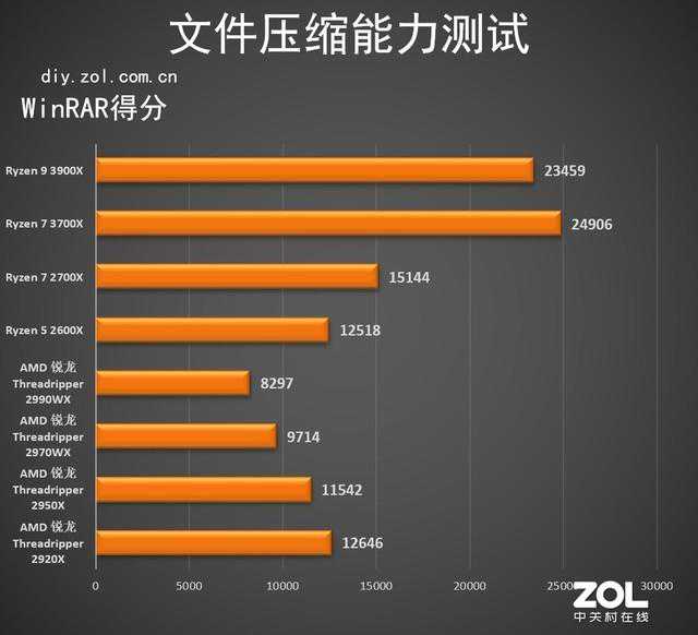 在WinRAR的测试中,Ryzen73700X分数超过了Ryzen93900X,而且分数仍然大幅领先二代锐龙。
