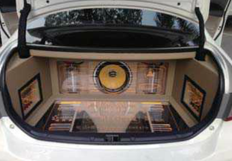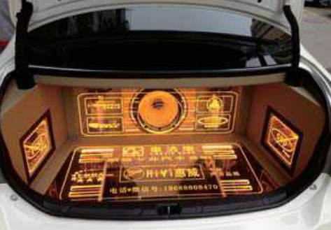 尾箱都分的改装,我认为是简洁之余,又略带视觉冲击感。仔细观察,改装的音响器材几乎没有占用尾箱空间,谓之简洁。可以看到在有机玻璃之下的器材陈列摆放明晰,配以单一金黄灯光,给人视学上焕然一新的感觉。