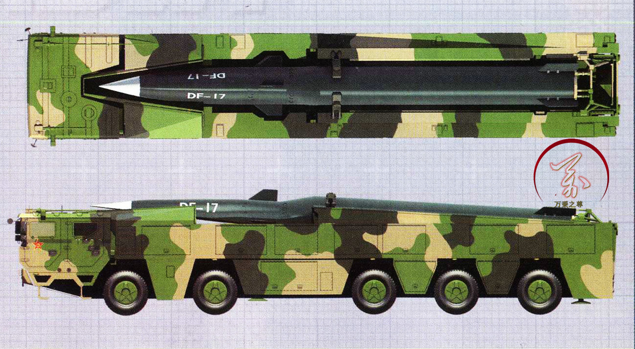 中国在研制两代再入机动弹头时积累了丰富的研制经验和拥有了模拟5~9倍声速的高超声速激波风洞,在高性能风洞的支持下中国就开始研制高升阻比的高超声速滑翔飞行器,2017年,中国两次从酒泉卫星发射中心试射了一种新型弹道导弹,导弹飞行了11分钟,射程1400公里,末段速度4马赫,平均速度2121米/秒(7马赫),飞行高度约60公里,落区位于新疆的且末县民丰靶场,命中误差仅为数米,这就是“东风”17高超声速导弹,“东风”17高超声速导弹使用和“东风”16弹道导弹相似的5轴运输-起竖-发射越野车,同样都使用1.2.米直径的单级固体火箭发动机,“东风”16弹道导弹射程达到1300公里,“东风”17高超声速导弹是升阻比为3的高升阻比再入飞行器,在40公里高度以10马赫开始滑翔,结束滑翔时高度30公里,速度为1公里1秒,最大射程可达1567公里。