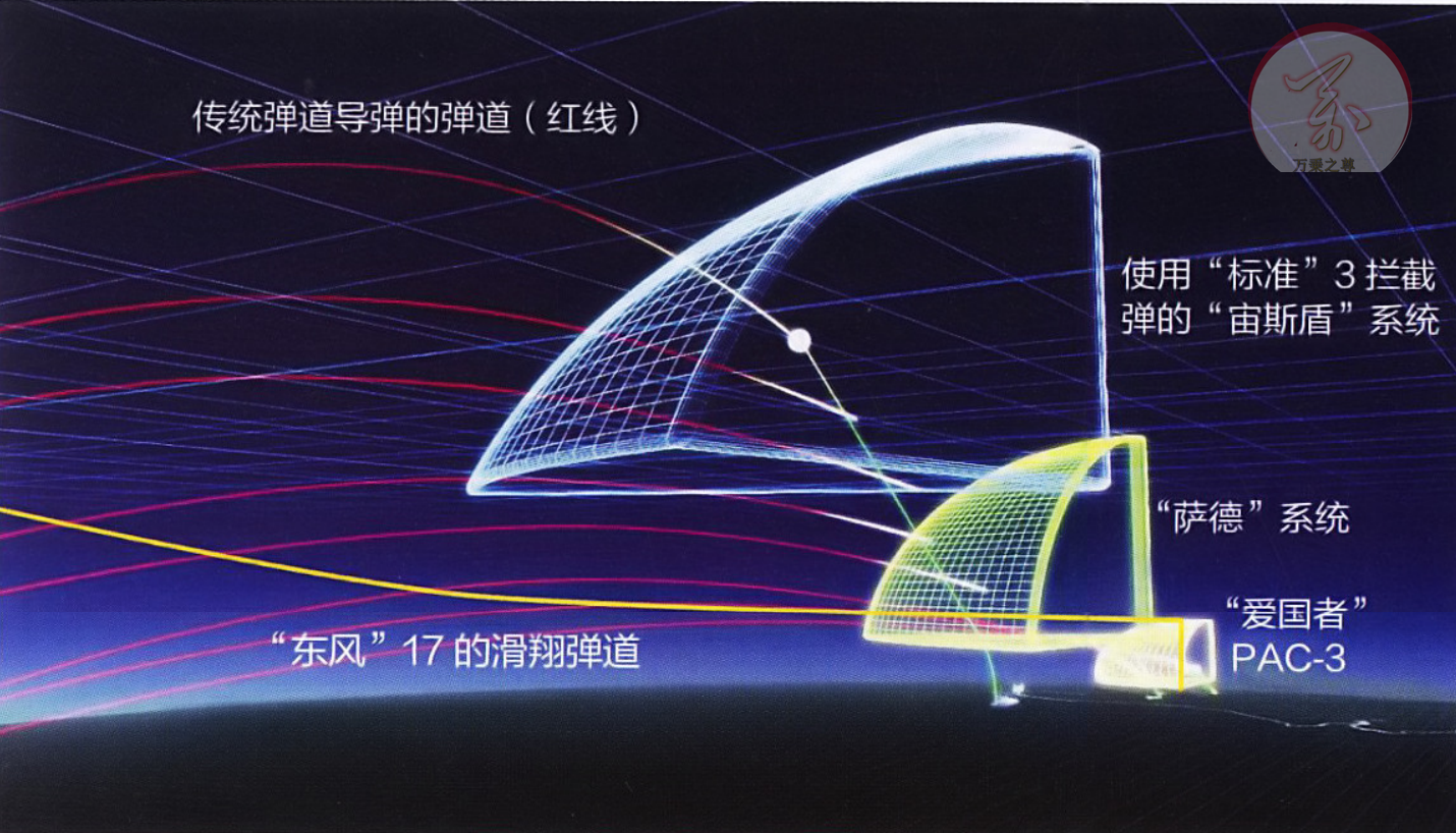 虽然“东风”17高超声速导弹末段速度只有4马赫,但弹道顶点低于常规弹道导弹,“东风”16弹道导弹弹道顶点320公里,“东风”17高超声速导弹才60公里,飞行中还会不断降低,美国的“萨德”反导系统拦截高度下限是40公里,美国的陆基远程预警雷达捕获弹道导弹的预警时间是14分钟,对“东风”17高超声速导弹的预警时间只有4分钟,有效距离大幅缩短就投人更多预警系统,美军的“萨德"系统和“宙斯盾”反导系统面对“东风”17高超声速导弹如形同虚设,在美国的“宙斯盾”.“萨德”、“爱国者"三层导弹防御系统中,“宙斯盾”和“萨德”分别负责中段防御和末端防御,只要中国发射弹道导弹突袭美军驻日基地,弹道必然经过朝鲜半岛,突袭美国本土弹道必然经过东北亚,美军只要将“宙斯盾”部署在弹道导弹来袭路线上就可以形成屏障,