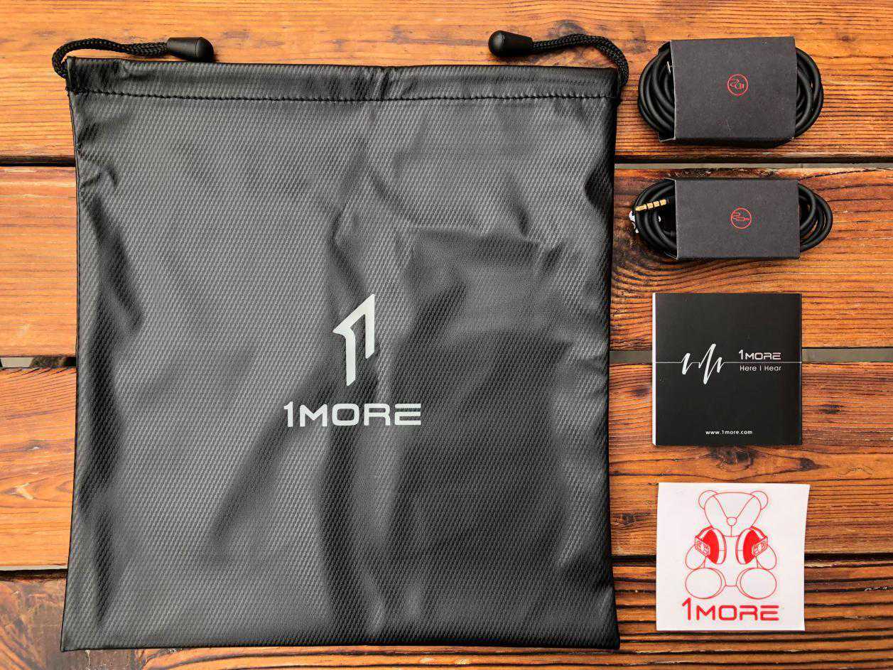 小纸盒内的耳机配件,分别是一个耳机收纳袋,一根microUSB接口数据线,一根3.5mm音频线,一本产品系列展示小手册和一张品牌贴纸。