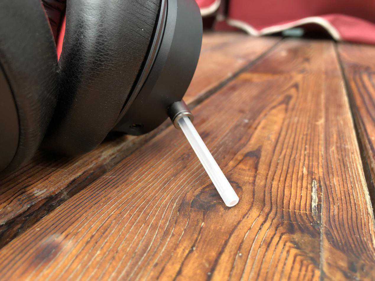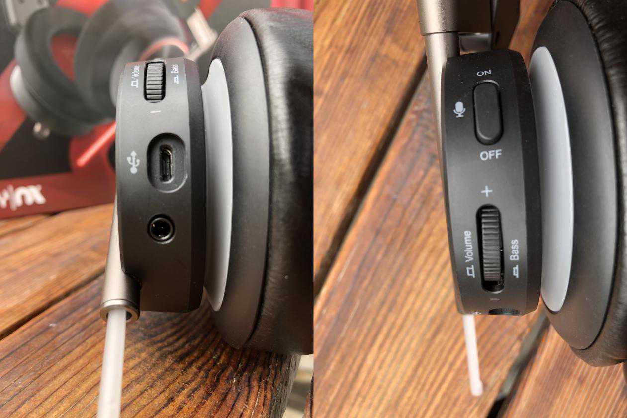 左音腔的侧面分别有和麦克风按钮、音量/重低音效滑钮、microUSB插口、3.5mm音频接口。按键和旋钮的触感很好,阻尼感扎实,可以方便用户在对战时盲控。