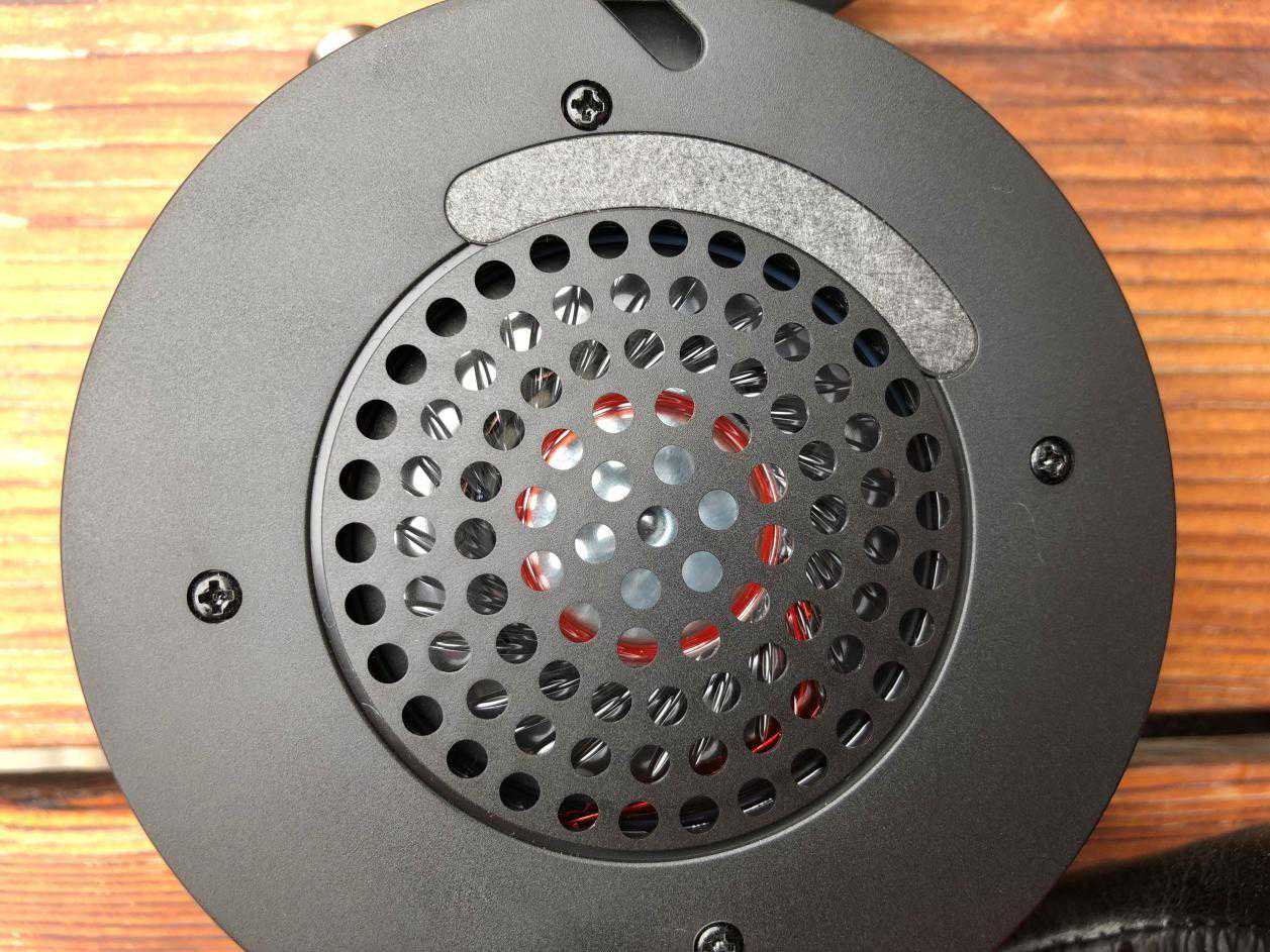 拆掉软质耳罩,可以看到该耳机的“核心”,50mm专利石墨烯震动单元呈旋转放射状,布置在音腔中心。