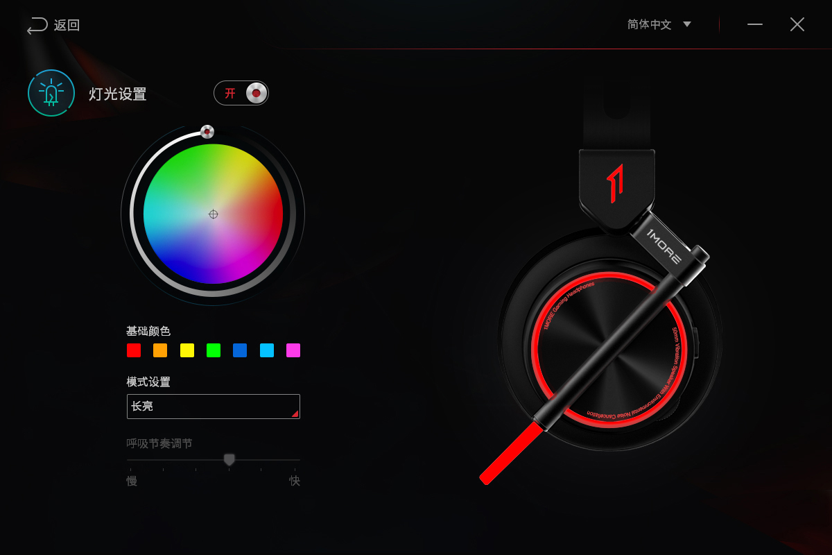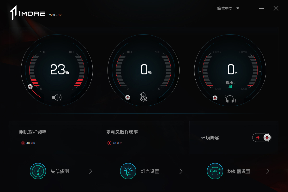 作为旗舰电竞耳机机型,1MoreSpearheadVRXPro还配有专属的软件,以最大限度发挥它的声场营造效果和RGB灯光氛围。上图是该软件的主界面,正中的三个选项为音量调节,麦克风调节和震动调节。选项中还显示了该耳机的喇叭取样频率和麦克风取样频率,还有一个环境降噪选项。