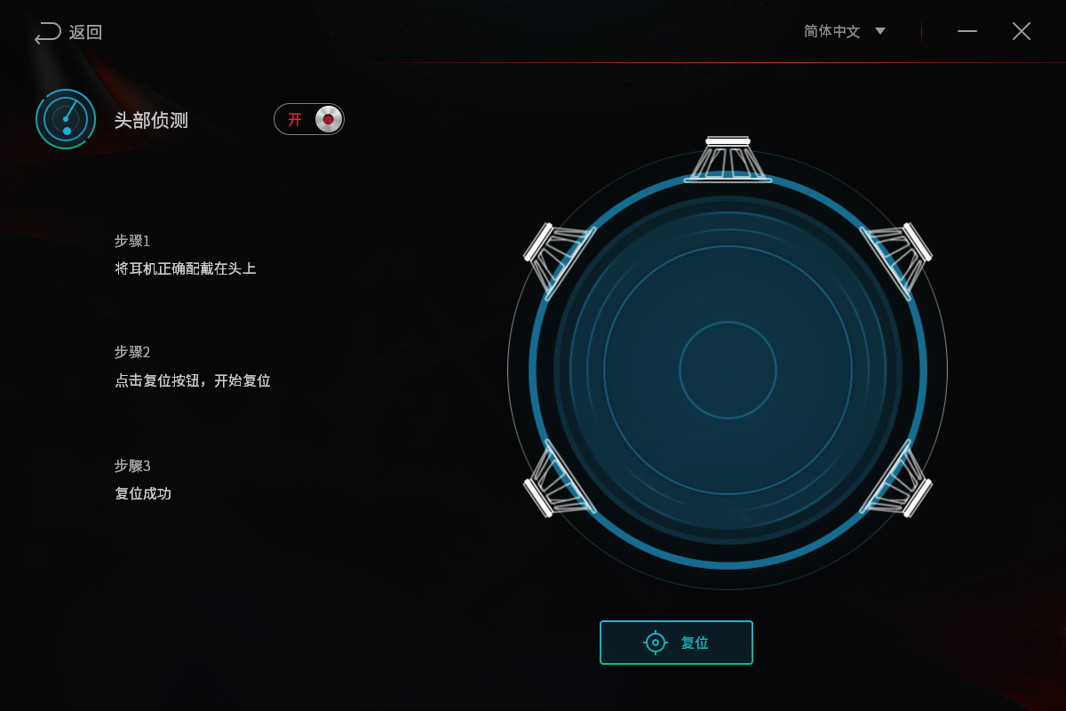 下方菜单的第一个功能是头部侦测,它能根据你目前头部的姿态和位置,定位并创造出最适合当前头部位置的立体声场,这对于FPS类等需要听声辫位的游戏绝对是一大神器。