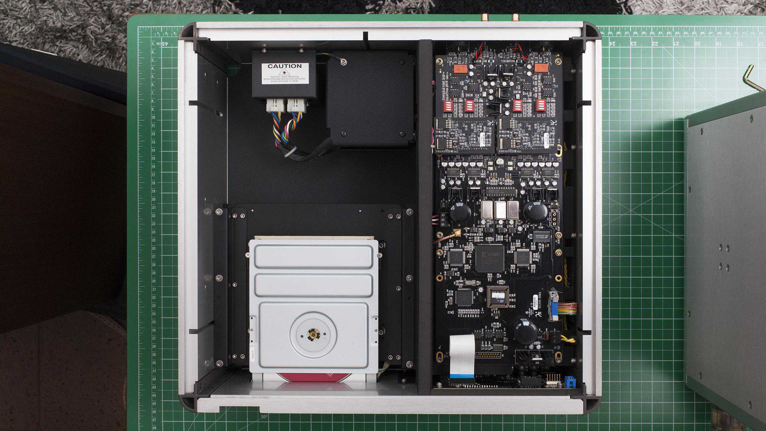 Wadia381内部非常的整洁,分为了两个区域,电源/光驱与电路板之间使用铝板隔开,同时电源还使用了屏蔽罩,以达到更好的电磁屏蔽性能。