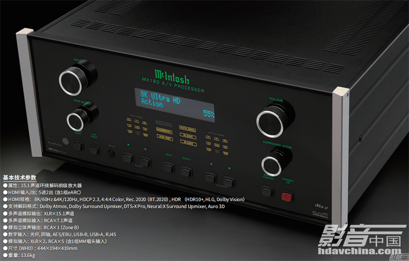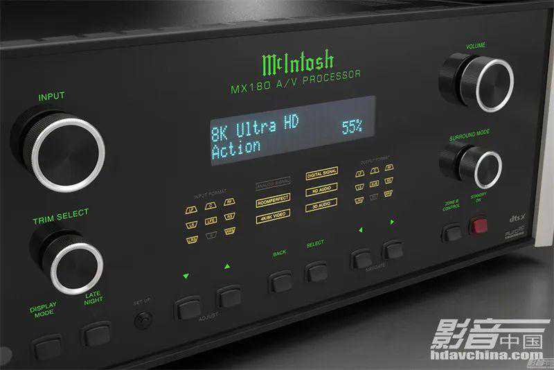 作为当今Hi-领域里最先进的家庭影院前级处理器,MX180拥有业界领先的环绕声音频解码技术,支持最新的各自沉浸式环绕声格式,完美对应DolbyAtmos、DTS:XPro与Auro-3D等当前主流的沉浸式三维音效,通过15.1声道的环绕声处理器可让玩家轻松构建出或9.1.6等大型的沉浸式环绕声影音系统。