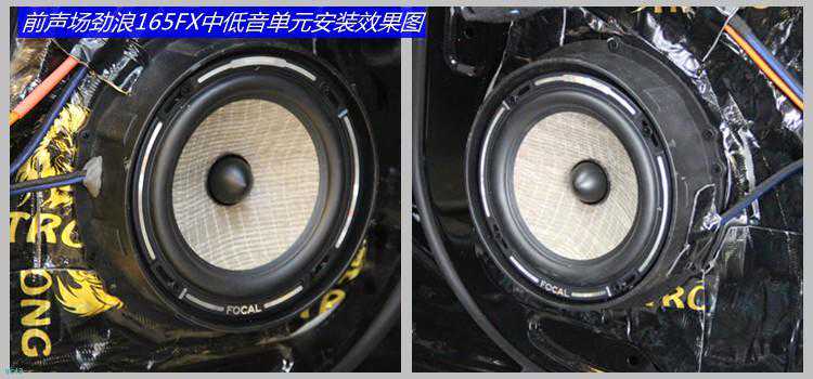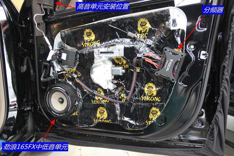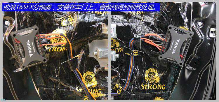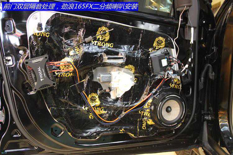 四门双层隔音处理,隔音材料采用环保高效的狮龙隔音材料!隔音车门之后,在原车喇叭位置对位安装法国劲浪PS165FX二分频喇叭。
