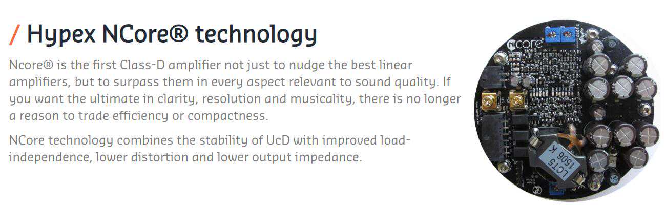 Hypex官方网站上充满自豪的介绍道:Ncore是一种前所未有的D类功放,在无需牺牲效率或紧凑性的情况下,提供极致的清晰度和音乐性表现,在音质等各个方面媲美甚至超越最好的线性功放!