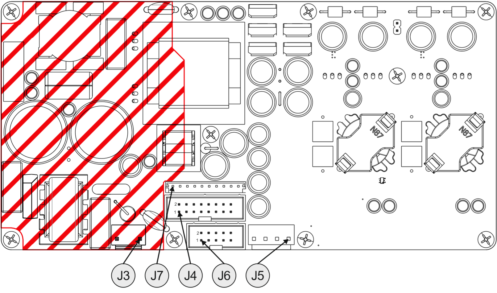 上图红色斜线覆盖的区域是板子上的高压区,开机状态下接触会有触电风险。用此模块制作立体声功放需要用到J3、J4、J5、J6等四个连接器。箭头所指为连接器的第1针脚。