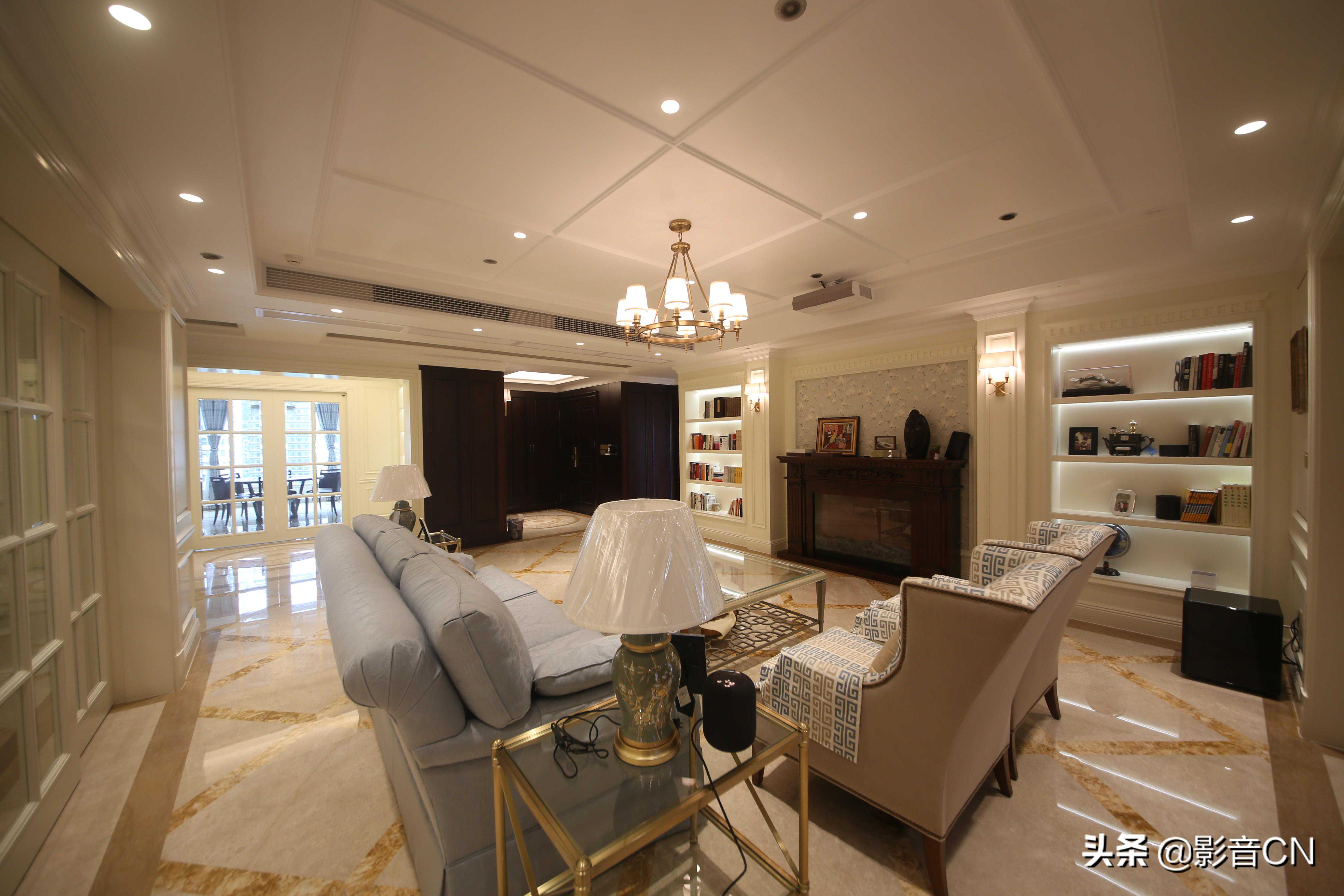 该项目是一大平层四居室住宅,入户右手边是开放式的大客厅,左手边分别是厨房、餐厅、酒水室以及各个卧室,空间格局南北通透,高雅大方。客厅面积很大,长方形的格局利用隔断柜,分割小空间做成了钢琴室。剩下拥有长5.4m,宽5.4m的空间,设计师需把这个像书房一样的开放式客厅,打造成为专业的客厅影院,以及全宅铺设各独立分区的智能家居设计,让居家在原有基础上更加高级。