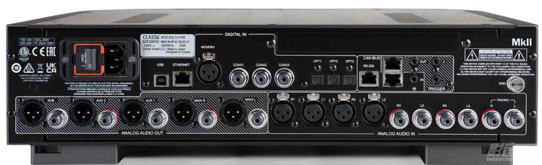 DeltaPreMKII前级的背部,左下角是5组模拟输出,可以实现2.0,2.1或2.2配置形式,而且RCA接口全部采用镀铑接口,同时DeltaPreMKII也能提供多种数字音频接口,包括USB-TypeB、网络流媒体、AES/EBU、同轴、TOSLINK光纤