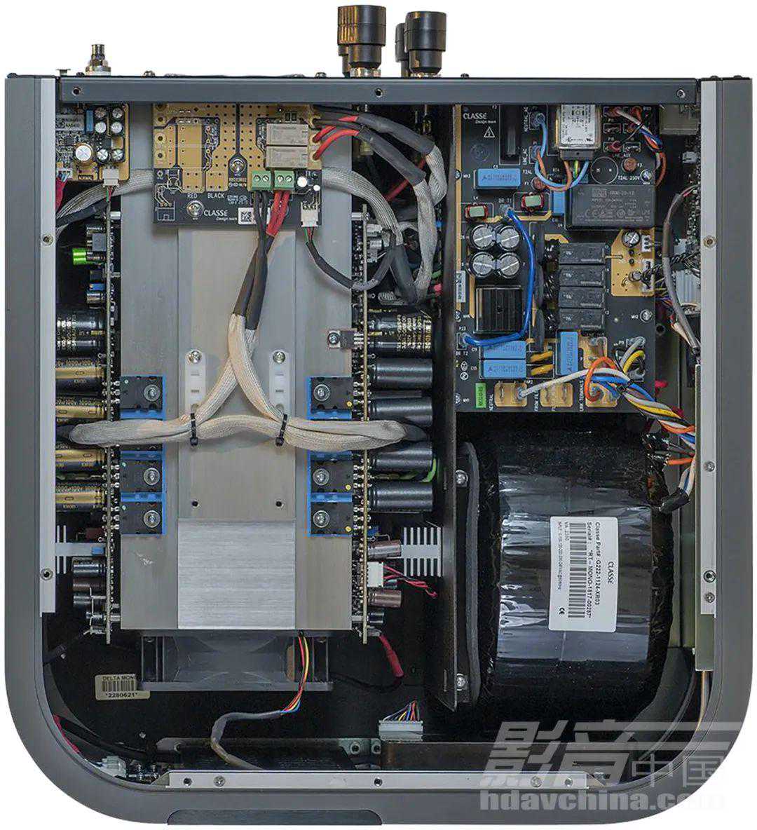 DeltaMono功率放大器的内部,功率管都安装在一个长方形的散热管道上,而且管道的两端都有风扇,从而形成对流,可以将机内的热量带出外面,这种设计的散热效率高