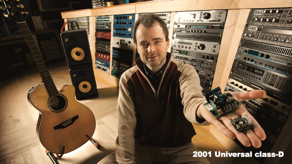 布鲁诺一开始的工作是设计AB类功放,可是他喜欢D类功放,所以在之后几年中,他没事儿就找那些上级主管,希望继续研发D类功放。到了1999年,正好当时公司有个项目,4位工程师花了2年的时间,研发了一种采用集成电路的D类功放,装在电视机里。有一位主管实在是被他烦的不行了,跟布鲁诺说:那你去负责收尾阶段的测试工作吧。