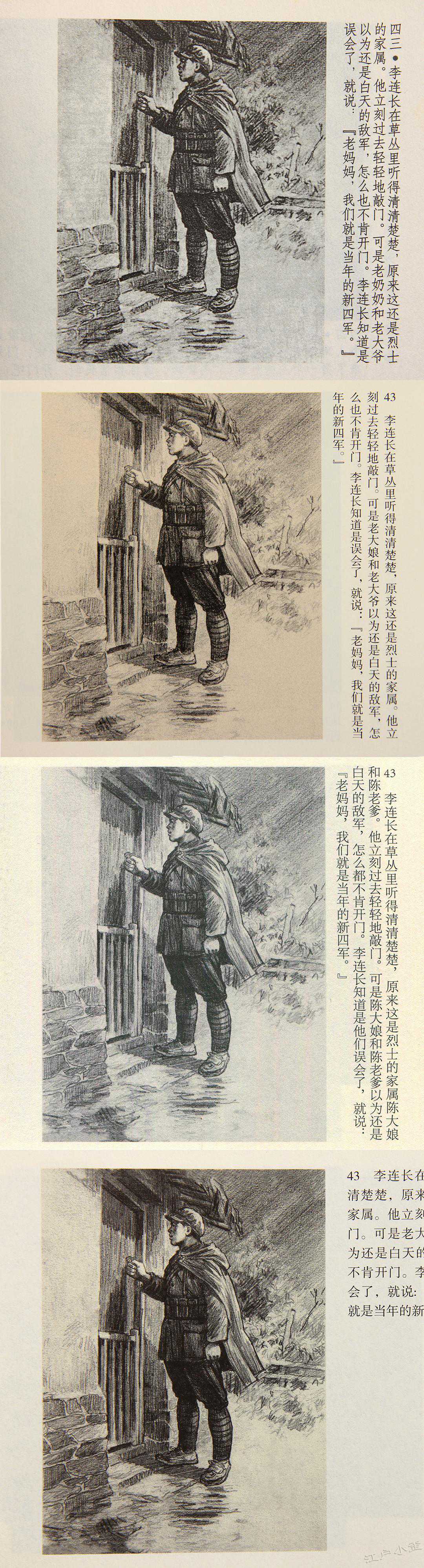 单说老版,就有1955年的上美初版、1956年外文版、1962的人美花边版、1977年上美版(77版将55初版画面做了微小修改,即军帽添上五角星,军装领口添领章,故而渡江被简单划分为55版和77版)。