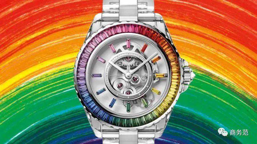 △CHANELELECTRO限定系列最近,香奈儿推出了以电子音乐为灵感的CHANELELECTRO限定系列高级制表作品。香奈儿腕表创意工作室总监ArnaudChastaingt在接受采访时,也提到自己创作这个限定系列的概念,就像是安排一组DJ演出曲目。全新J12ElectroDream,一改J12“非黑即白”的style,将12种颜色的蓝宝石融合成彩虹圈,刻度也12色宝石构成,华丽炫酷,有黑白陶瓷两款可选↓