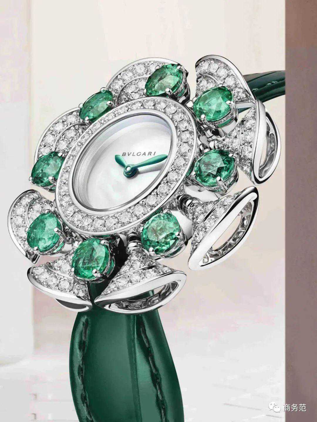 Divissima腕表有两款新品,分别采用全钻和钻石间祖母绿材质,表壳四周的Divas'Dream系列经典扇形图案,更增添了几分飘逸感,好像绽放的花朵一样。