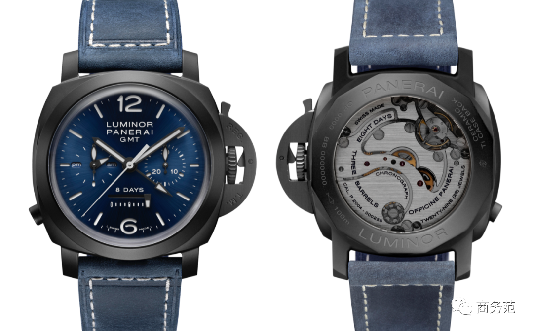 还有一款LuminorChronoMonopulsanteGMTBluNotte庐米诺系列单按钮计时两地时腕表(PAM01135),午夜蓝表盘采用经典的三明治式结构,饰以精致的太阳放射纹,配备深蓝色小牛皮表带,造型相当复古,限量发行200枚。