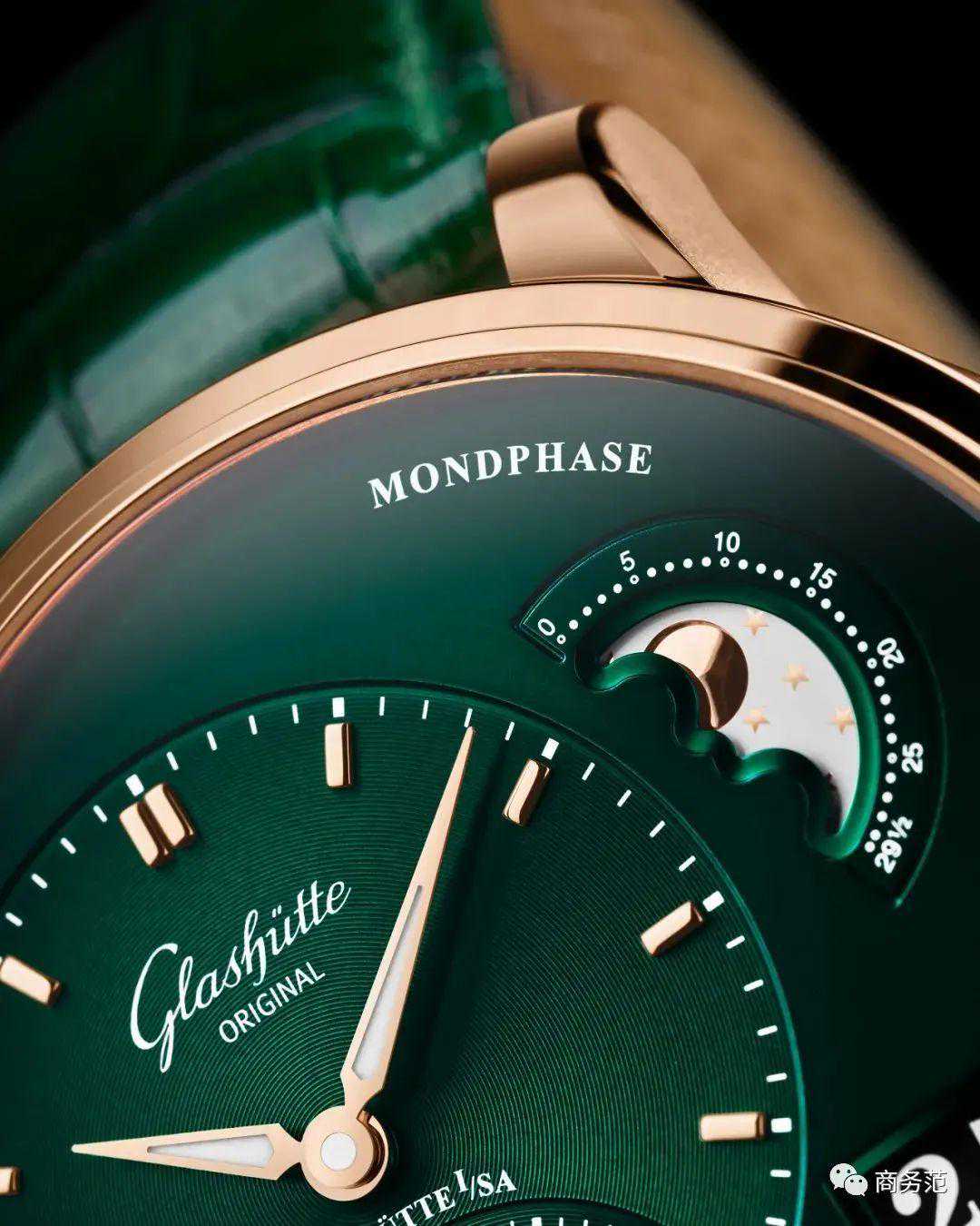 格拉苏蒂原创全新偏心月相这次也新发了一款绿盘表。不对称表盘、大日历窗都是经典元素。最吸睛的还是色彩渐变,从中心处的深绿开始,到边缘渐变为黑色,非常显质感。