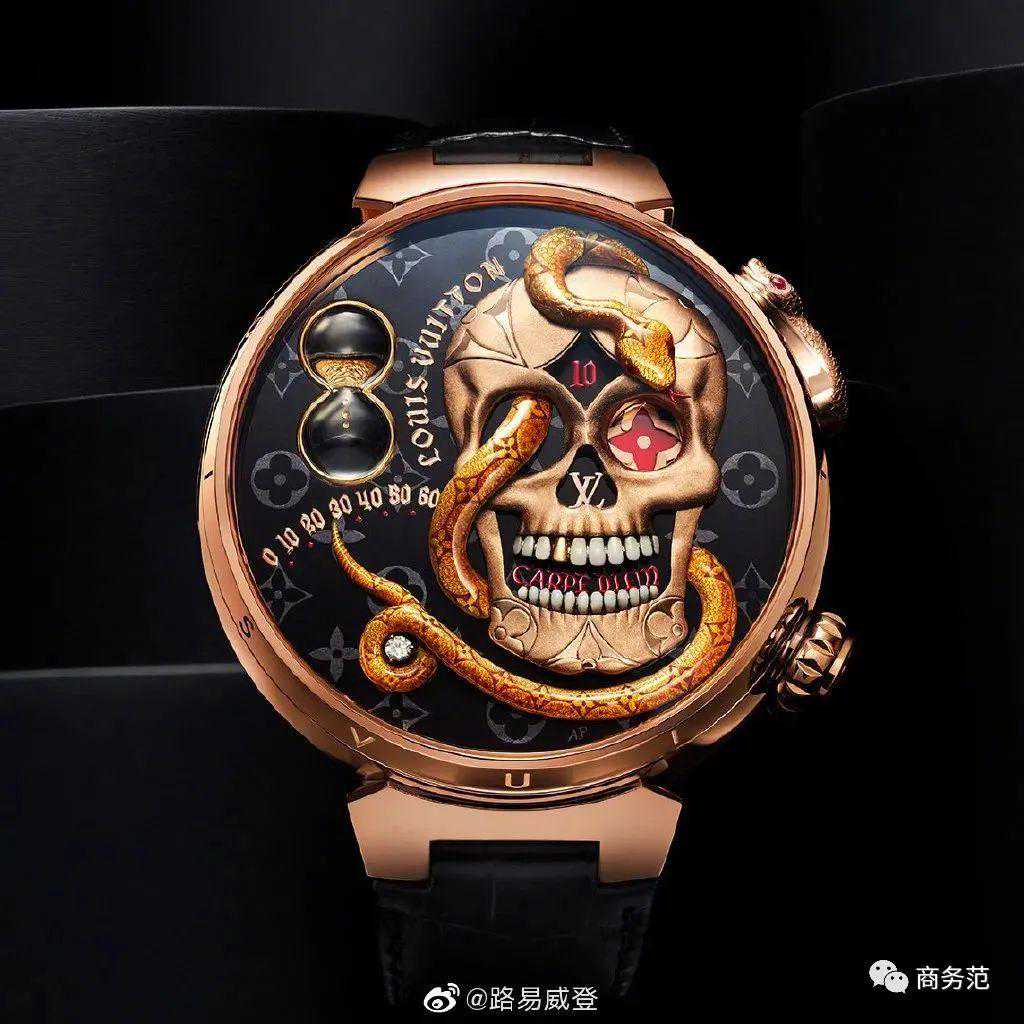 LV这次新出了一款TmabourCarpeDiem腕表,画风相当奇特。老花表盘上分布着骷髅头、蛇与沙漏,代表了流逝的时间。